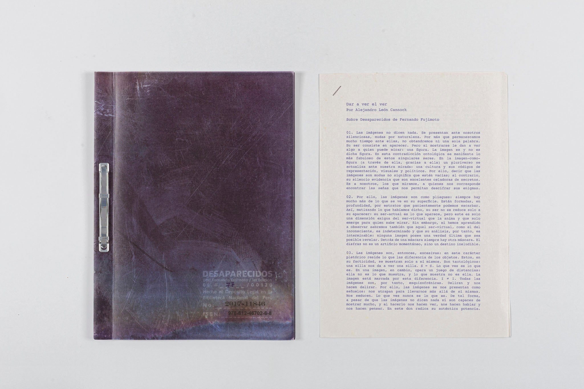 Desaparecidos, de Fernando Fujimoto (Lima, 1977), presenta imágenes informes, veladas y marcadas, con apenas presencias figurativa. La naturaleza del libro, que se asemeja a un folder de documentos, enmarca la lectura. En este espacio vacío, las imágenes sugieren un desvanecimiento y una antigüedad, pero las huellas solo implican la apariencia de que algo pasó por ellas.